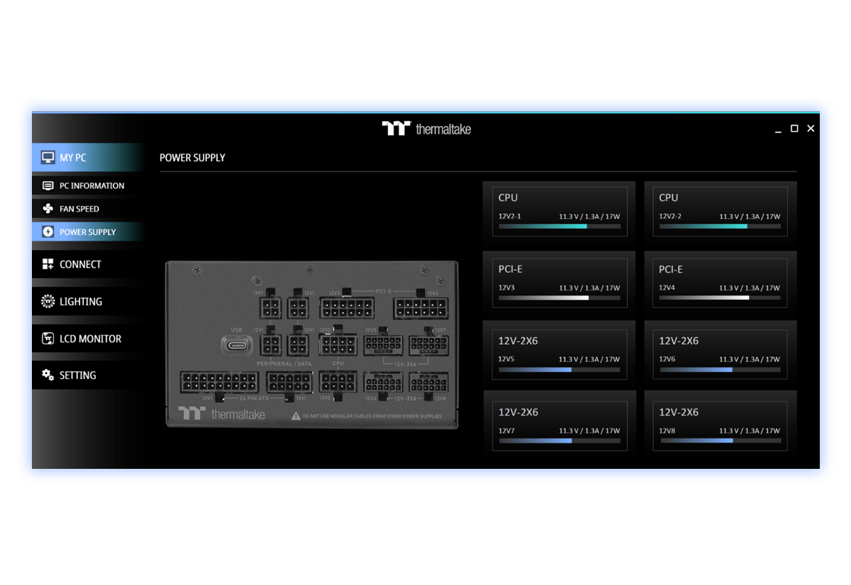 It offers real-time power monitoring via TT RGB PLUS software and switchable single/multi-rail mode for ultimate stability and control.