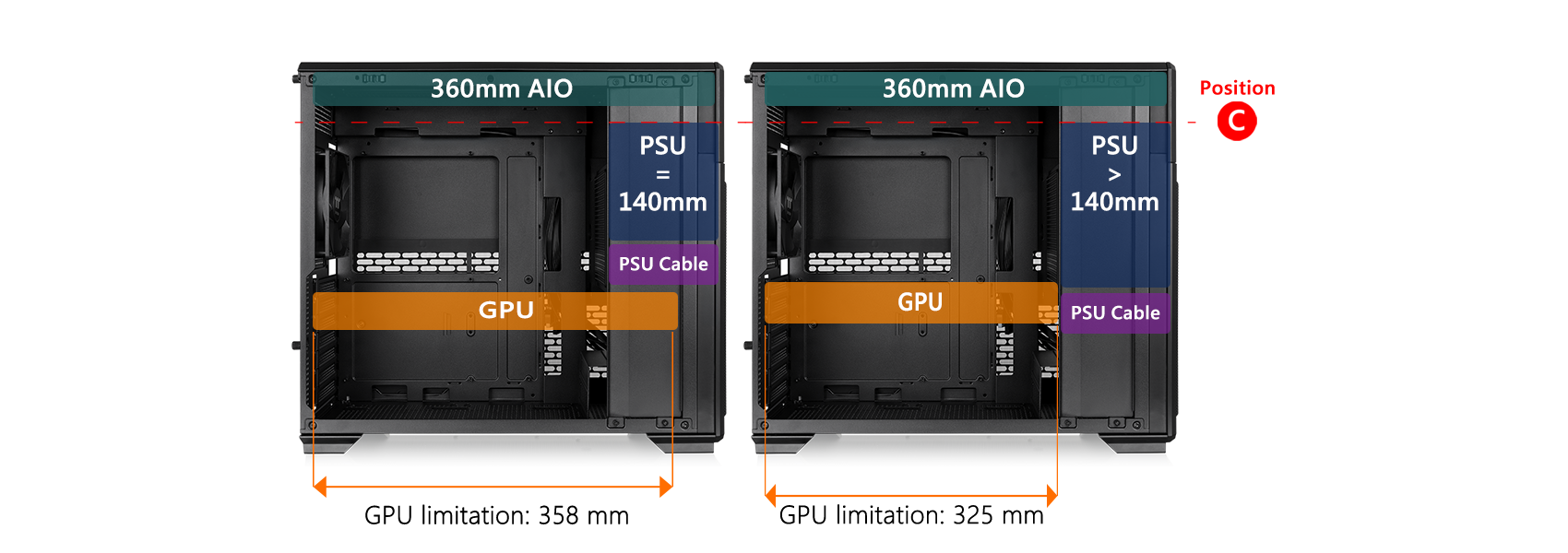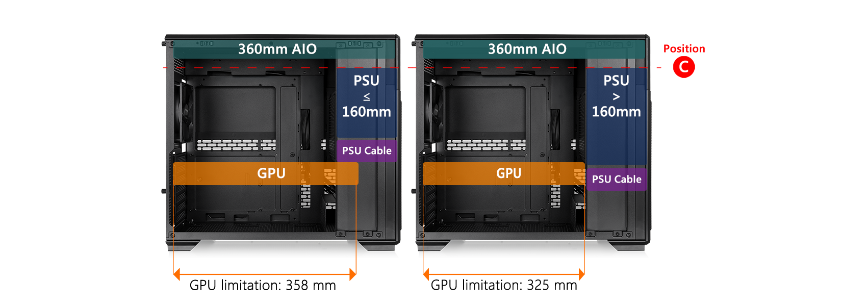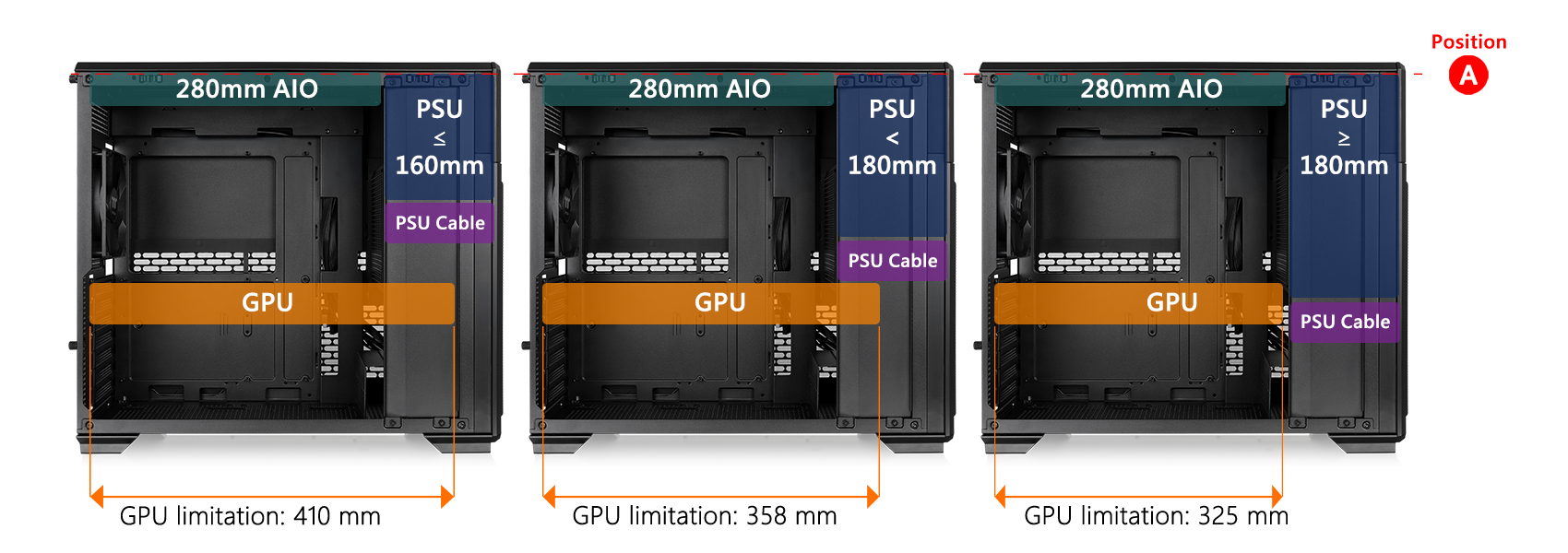 CPU cooler height limitation: 165mm VGA length limitation: 410mm (PSU length≤160mm) PSU length limitation: 260mm(VGA length<325mm) 160mm(VGA length>325mm) |